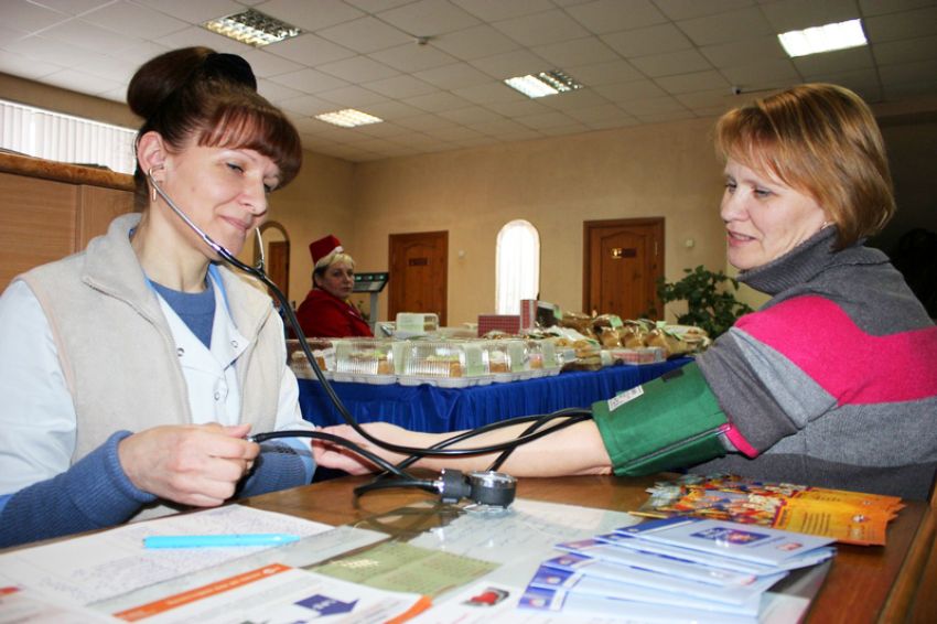 Медицинский работник предлагает избирателям измерить давление.