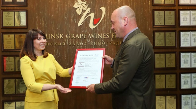 Руководитель белорусского представительства международного органа по сертификации TUV Thuringen (штаб-квартира в ФРГ) Марина Кондраль вручила генеральному директору ЗАО «Минский завод виноградных вин» Ивану Троцкому сертификат, подтверждающий соответствие крепкой алкогольной продукции этого предприятия стандарту FSSC 22000 (Food Safety System Certification). Выполнение требований данного стандарта — это наивысший уровень оценки для производителей пищевой продукции. Эта система одобрена Глобальной инициативой по пищевой безопасности и интегрирует в себе весь мировой опыт по контролю за качеством выпуска безопасной продукции.