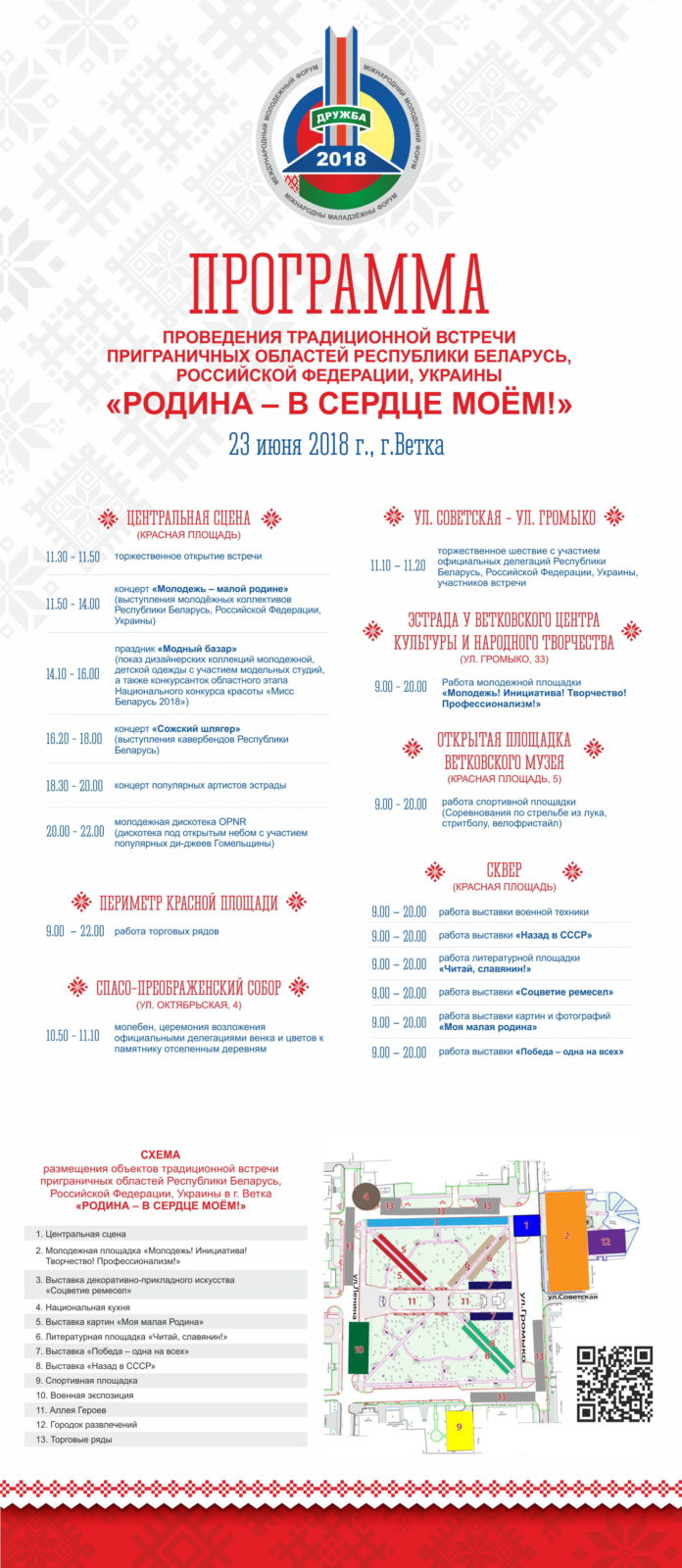 Домой Новости В области Традиционная встреча приграничных областей Республики Беларусь, Российской Федерации, Украины в городе Ветка... НовостиВ областиОбщество Традиционная встреча приграничных областей Республики Беларусь, Российской Федерации, Украины в городе Ветка и Международного молодежного форума «Дружба-2018» Автор Светлае жыццё - 18.06.2018 1171 0 Если вы нашли ошибку, пожалуйста, выделите фрагмент текста и нажмите Ctrl+Enter. Like Like Love Haha Wow Sad Angry СХОЖИЕ СТАТЬИБОЛЬШЕ ОТ АВТОРА Новости Герой своего времени, строитель будущего Мнение Светлана Сенько: 26 апреля для Беларуси навсегда останется напоминанием об ответственности человечества за судьбу планеты Новости 26 апреля — 40 лет со дня аварии на Чернобыльской АЭС Конкурс Юные таланты Молодёжь Взгляд в будущее В мире В Польше из-за снижения рождаемости закрываются родильные отделения Добавить комментарий Отменить ответВойдите, чтобы оставить комментарий Войти с помощью: Новое на сайте Герой своего времени, строитель будущего 26.04.2026 Гороскоп на 26 апреля 26.04.2026 Светлана Сенько: 26 апреля для Беларуси навсегда останется напоминанием об ответственности... 26.04.2026 26 апреля — 40 лет со дня аварии на Чернобыльской АЭС 26.04.2026 Юные таланты 25.04.2026