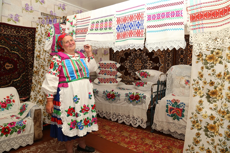 Галина Малиновская, улыбчивая, приветливая хозяйка, встретила нас в вышитом своими руками наряде в национальном стиле, радушно пригласила в дом. Когда вошли, показалось, что попали в музей народного творчества — всюду разноцветными узорами, орнаментами, яркими цветами украшали комнату вышитые, тканые изделия мастерицы, причём, одно другого краше. В городской квартире такого не увидишь! Несколько минут стояла, наслаждалась этой удивительной красотой.