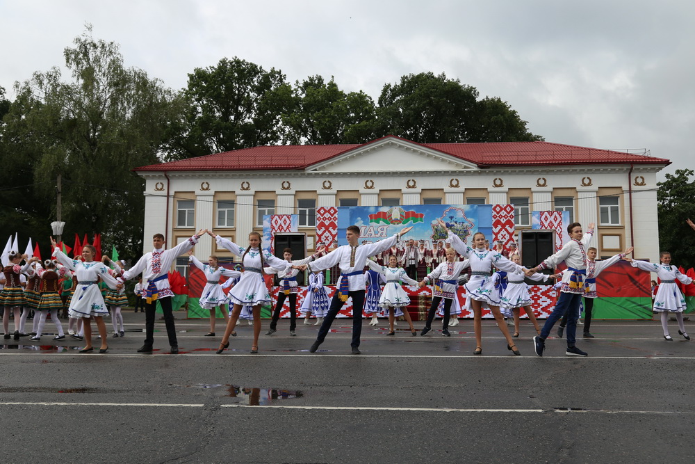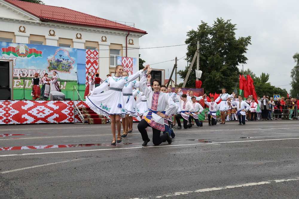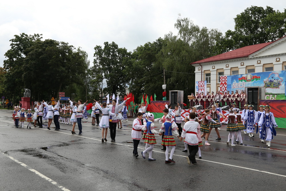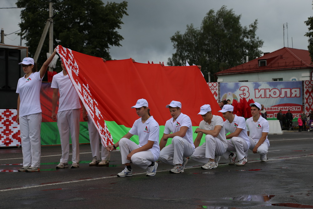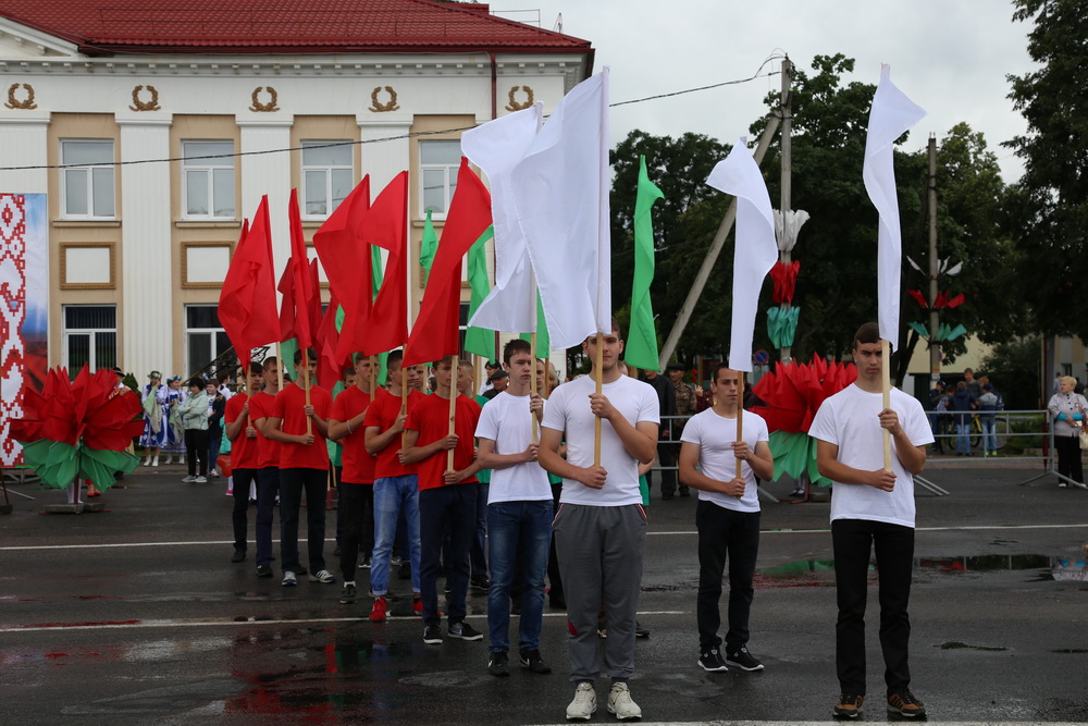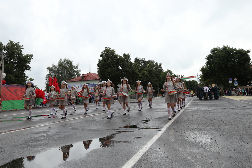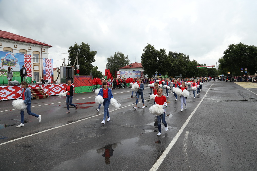 В продолжение праздничного торжества наши лучшие спортсмены, неоднократные победители международных, республиканских и областных соревнований и турниров, вынесли на площадь большой флаг Республики Беларусь — символ государственного суверенитета нашей страны. Зрелищно прошествовали девочки-барабанщицы, чеканным строевым шагом промаршировали сотрудники районного отдела внутренних дел, районного отдела по чрезвычайным ситуациям, военнослужащие-пограничники. Их сменили дети на роликах, которые держали в руках картинки «Я люблю Беларусь», затем проследовали колонны велосипедистов и мотоциклистов.