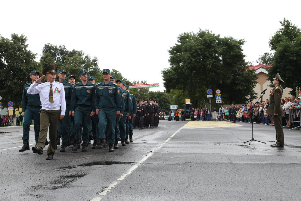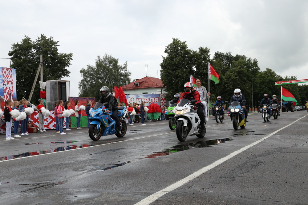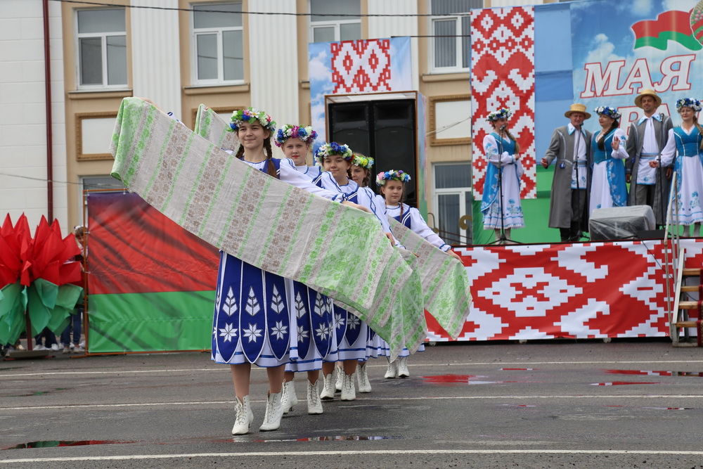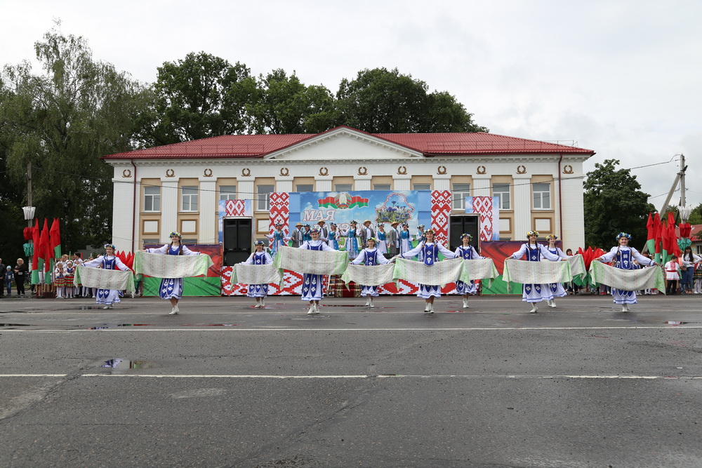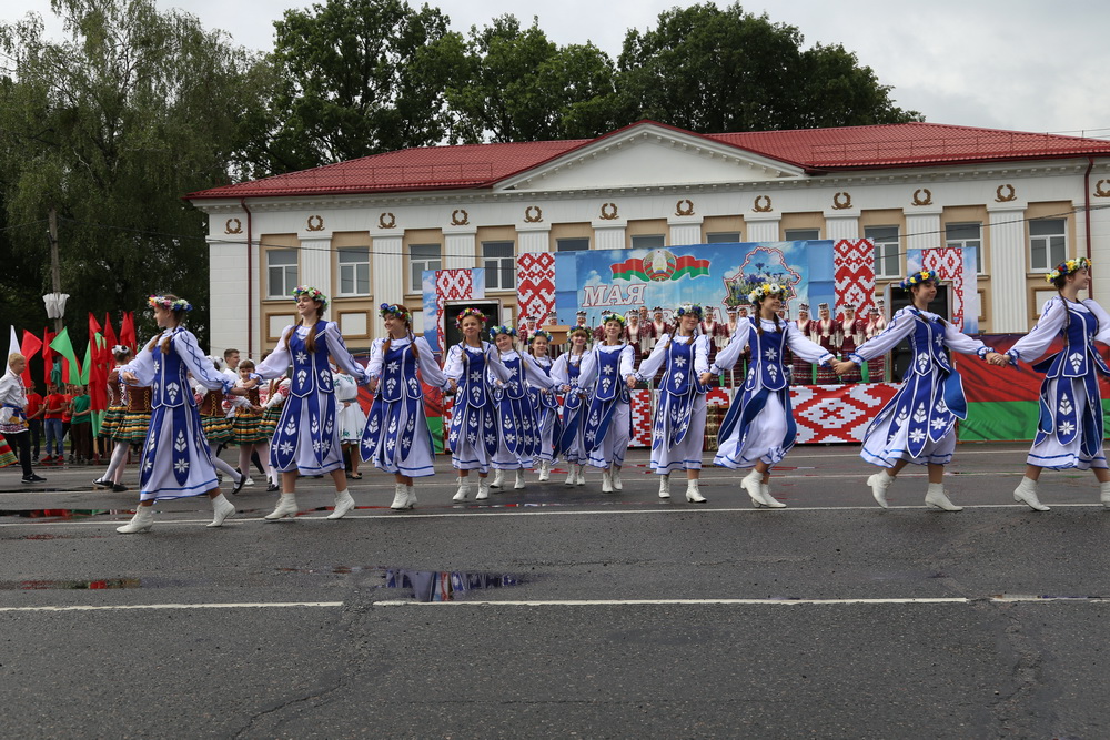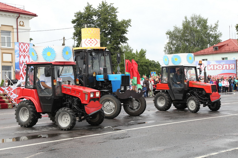 В продолжение праздничного торжества наши лучшие спортсмены, неоднократные победители международных, республиканских и областных соревнований и турниров, вынесли на площадь большой флаг Республики Беларусь — символ государственного суверенитета нашей страны. Зрелищно прошествовали девочки-барабанщицы, чеканным строевым шагом промаршировали сотрудники районного отдела внутренних дел, районного отдела по чрезвычайным ситуациям, военнослужащие-пограничники. Их сменили дети на роликах, которые держали в руках картинки «Я люблю Беларусь», затем проследовали колонны велосипедистов и мотоциклистов.