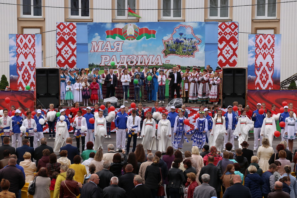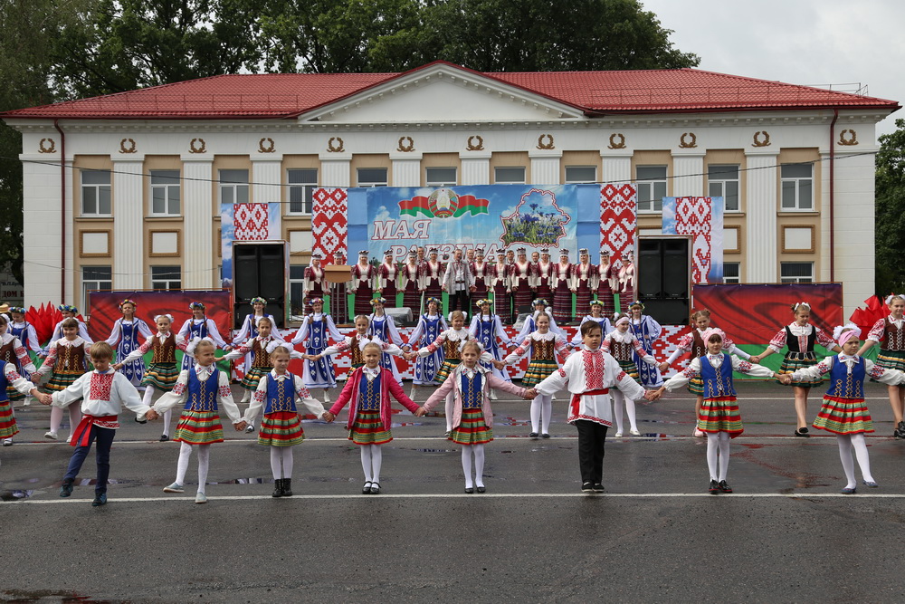 Затем все прошли на городскую площадь, где развернулось главное празднество. Яркой хореографической зарисовкой открыли театрализованную композицию «Радзіма мая дарагая» наши юные таланты, одетые в национальные костюмы.