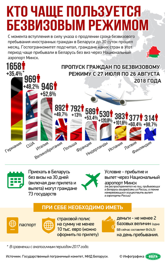 Приехать в Беларусь без визы на 30 дней (включая дни прилета и вылета) могут граждане 73 государств.