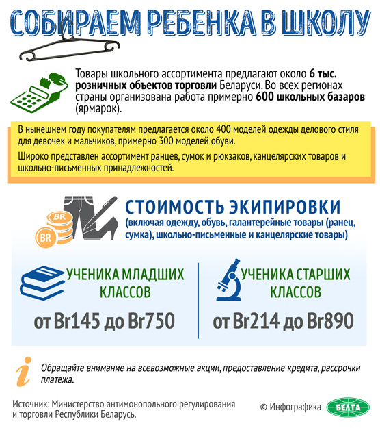 Товары школьного ассортимента предлагают около 6 тыс. розничных объектов торговли Беларуси. Во всех регионах страны организована работа примерно 600 школьных базаров (ярмарок).