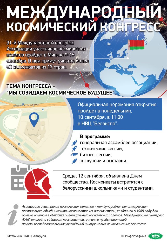 Глава государства признался, что лично очень ждал этого мероприятия. В Беларуси к нему готовились очень серьезно. «Направляясь к вам на это большое собрание, я подумал, что еще, наверное, никогда не только в этом зале, но и в Минске не было столько героев. Позвольте мне от имени белорусского народа приветствовать на этом конгрессе вас, людей героических, совершивших подвиги в жизни, ученых, которые обеспечивали эти полеты и занимались развитием космической науки», — сказал Александр Лукашенко.