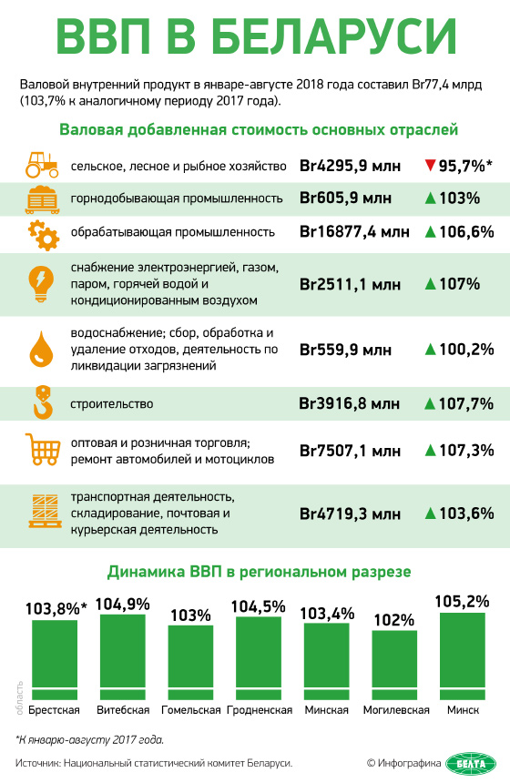 Валовой внутренний продукт в январе-августе 2018 года составил Br77,4 млрд (103,7% к аналогичному периоду 2017 года).