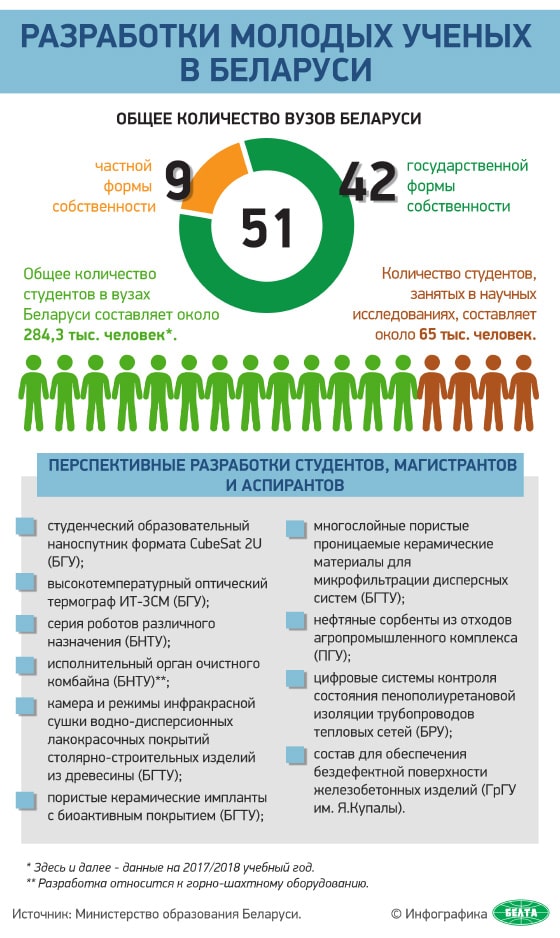 Общее количество вузов Беларуси — 51, из них 9 частной формы собственности, 42 государственной формы собственности.