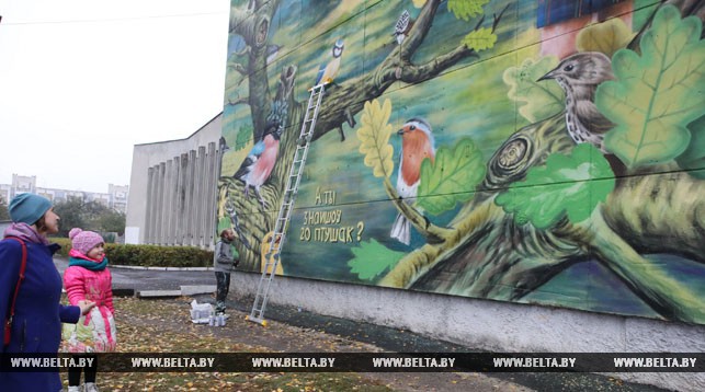 1 ноября, Минск /Корр. БЕЛТА/. Стена гомельской средней школы №27 стала полотном для художника из Пинска Евгения Сосюры. На бетонном холсте площадью около 170 кв. м Евгений выполнил граффити, где изображено 20 видов птиц, населяющих Гомельский регион.
