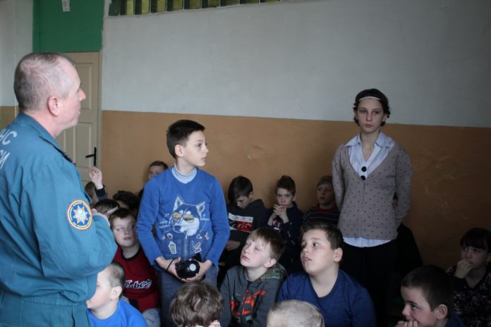 Во время тренировок по действиям при пожаре с младшими школьниками отрабатываются практические навыки эвакуации: движение группой, движение гусиным шагом под дымом, ознакомление с работой огнетушителя.
