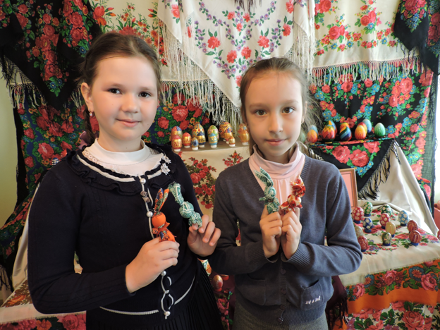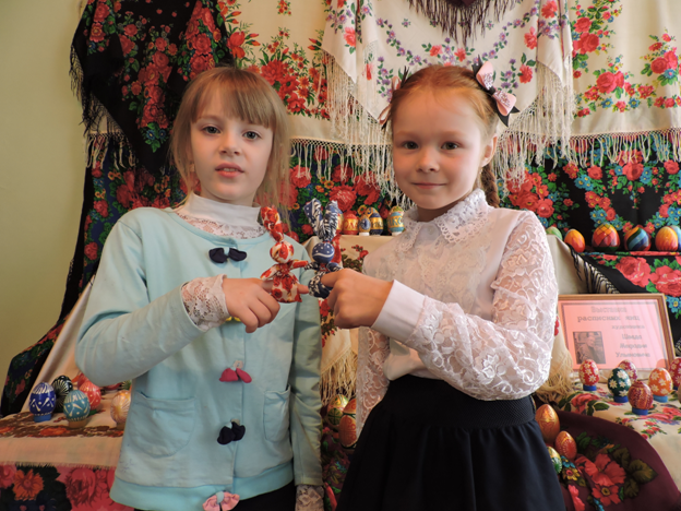 Дети остались очень довольны результатом изготовления куколки и запечатлели свои творения на фоне выставки пасхальных яиц Шведа М.У., которая сейчас представлена в музее.