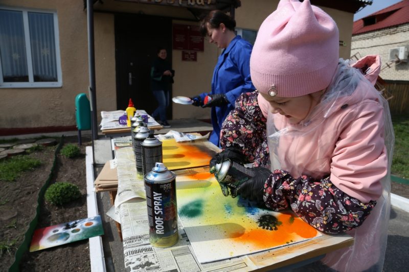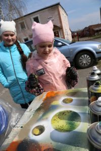 Для своих картин ребята использовали разноцветные баллончики, пластиковые тарелки для изображения планеты и бумагу— для получения эффекта космической пыли.