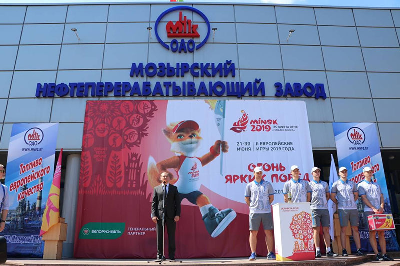На мозырском НПЗ право зажечь факел было предоставлено белорусскому композитору, продюсеру, лидеру группы Aura Евгению Олейнику, который пронес огонь по территории завода. Затем кортеж направился в совхоз-комбинат “Заря”, где для встречи огня были подготовлены флешмоб и яркая детская танцевальная программа.