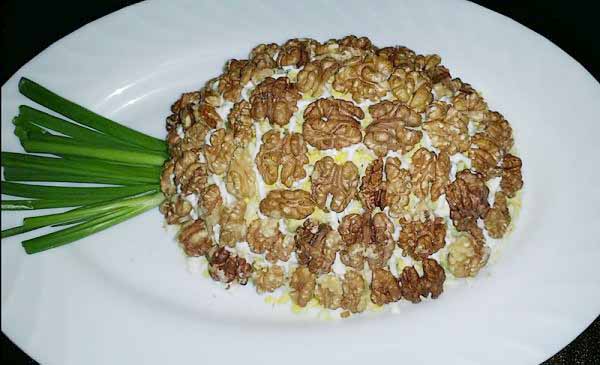 Ингредиенты: 1 ананас, 400 г вареной курицы, 1/2 стакана грецких орехов, пучок кинзы, 5 стеблей зелёного лука, 4 ст. л. майонеза, 1/2 ч. л. карри, молотый острый перец, соль.