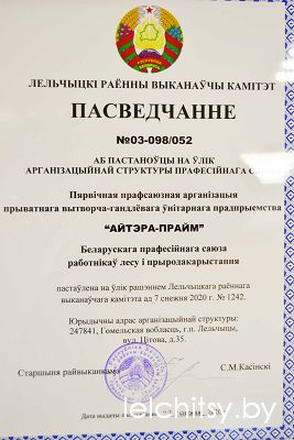Свидетельство вновь создавшейся первичке вручили председатель Гомельской областной организации Белорусского профсоюза работников леса и природопользования Александр Василенко и председатель Лельчицкого районного объединения профсоюзов Татьяна Москалевич.