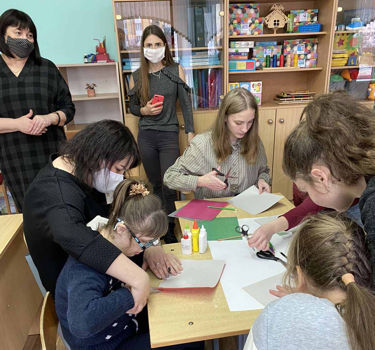 Специалисты управления приняли участие в мероприятии по изготовлению детьми вместе с волонтерами из Лельчицкой районной гимназии цветных аппликаций.