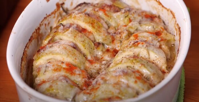 Запекать кабачки нужно при температуре 180 °С в течение 45 минут. После этого достаем форму, посыпаем блюдо тертым сыром и отправляем запекаться еще на 3–4 минуты, чтобы образовалась аппетитная корочка. Перед подачей шеф-повар рекомендует посыпать блюдо черным молотым перцем и копченой паприкой.
