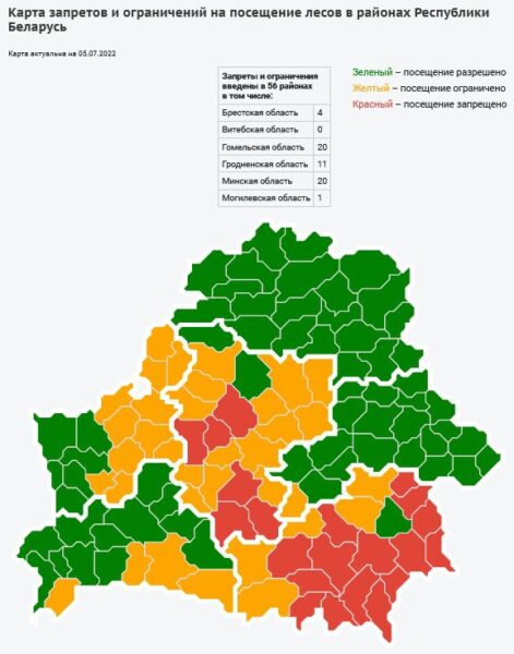 По состоянию на утро 5 июля, запреты и ограничения на посещение лесов действуют в 56 регионах страны.