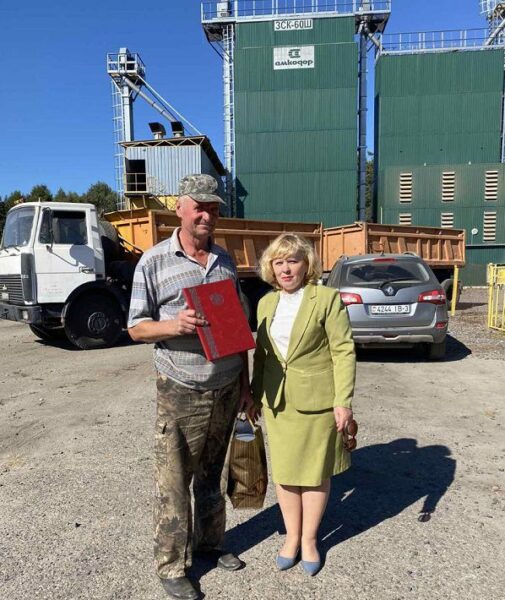 Председатель Лельчицкой районной профсоюзной организации Белорусского профсоюза работников агропромышленного комплекса Алла Камыш вручила водителю ОАО «Лельчицкий агросервис» Юрию Гречко, занятому на перевозке зерна, заслуженную награду — Благодарственное письмо Лельчицкого районного исполнительного комитета и ценный подарок от районного комитета профсоюзов.