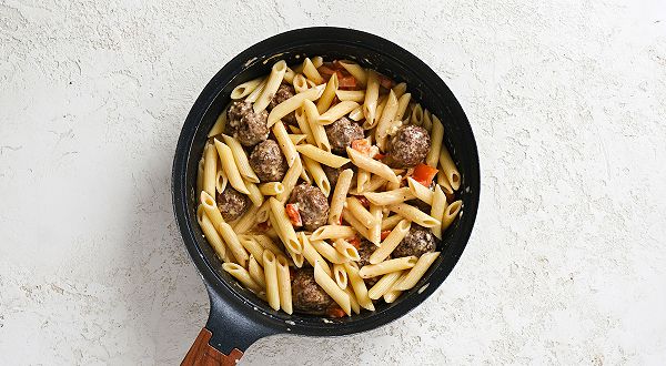 Добавьте в сковороду макароны и перемешайте. Прогрейте 1–2 мин, чтобы соус полностью покрыл пасту. При необходимости добавьте ещё немного жидкости.