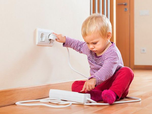 В гостиной лучше установить заглушки на розетки и убрать провода под плинтус, объяснив детишкам, что опасно тянуть руками за электрический провод.