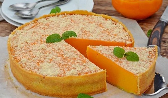 Для приготовления пирога на 8 порций потребуется: тыква — 500 граммов, мука пшеничная высшего сорта — 280 граммов, сливочное масло — 250 граммов, сахар — 180 граммов, 4 желтка, 1 апельсин и 5 граммов разрыхлителя.