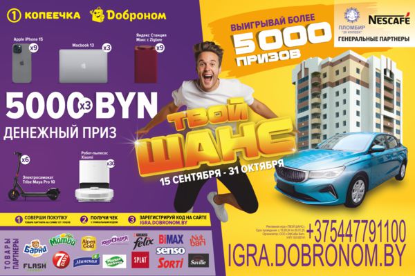 С 15 сентября по 31 октября в магазинах «Копеечка» и «Доброном» проводится рекламная игра «ТВОЙ ШАНС» с потрясающими призами: квартира в Минске, автомобиль Geely, смартфоны и ноутбуки Apple, умные колонки Яндекс Станция Макс, электро-самокаты, роботы-пылесосы, денежные призы по 5 000 рублей и очень много подарочных сертификатов. Приобретайте товары-партнеры и получайте уникальный код за каждый потраченный рубль.