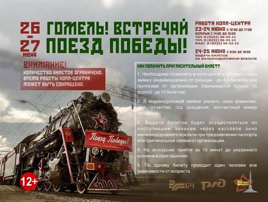Уникальный передвижной музей «Поезд Победы», посвящённый подвигу советского народа в годы Великой Отечественной войны, сделает двухдневную остановку в Гомеле – 26 и 27 июня. В связи с ожидаемым высоким спросом, организаторы решили упорядочить посещение экспозиции и организовать заказ пригласительных через кол-центр.