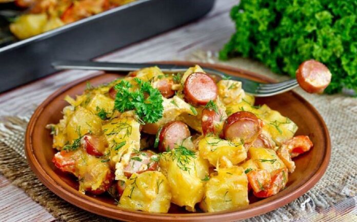 Простое, но достаточно интересное блюдо — запечённая картошка с сосисками, помидорами и сыром. Ломтики картофеля в духовке получатся мягенькими, сосиски станут хорошей заменой мясу, помидоры добавят сочности, майонез поможет «сдружить» ингредиенты между собой, а сыр расплавится и сделает блюдо ещё аппетитнее. Очень вкусно, да и готовится элементарно — справится каждый!