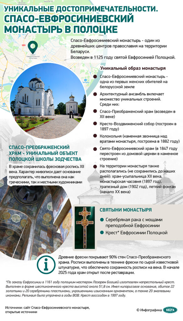 Спасо-Евфросиниевский женский митрополичий монастырь в текущем году отмечает 900-летие со дня основания. Он также включен в Государственный список историко-культурных ценностей Республики Беларусь. Восстановительные работы на объектах монастыря, прежде всего – Спасо-Преображенском храме, ведутся с 2007 года, в том числе в рамках выполнения Государственной инвестиционной программы.