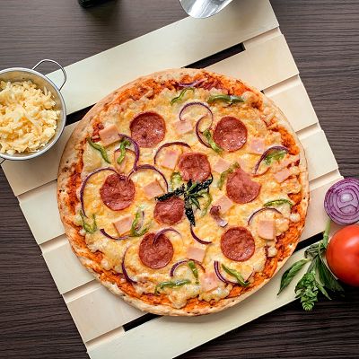 Описание приготовления: Начинка может быть самая разнообразная, готовится пицца достаточно просто и станет отличным дополнением к трапезе на свежем воздухе. Тесто можно приготовить заранее в домашних условиях по вашему любимому рецепту или отдать предпочтение уже готовой основе для пиццы, которую найти в магазине на данный момент не составляет никакого труда.